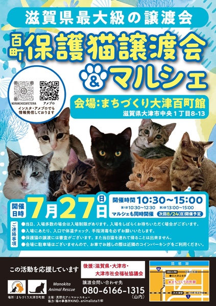 | イベント内容 | 滋賀県最大級の保護猫譲渡会。 毎回40頭以上の猫さんが参加します。 初めての方でも安心して譲渡の安心サポートの譲渡会です。 予約不要、入場無料。 参加猫さんのご紹介は https://ameblo.jp/hyakucyojyoutokai または、Instagram @hyakucyoujyotokai をご覧下さい。 |