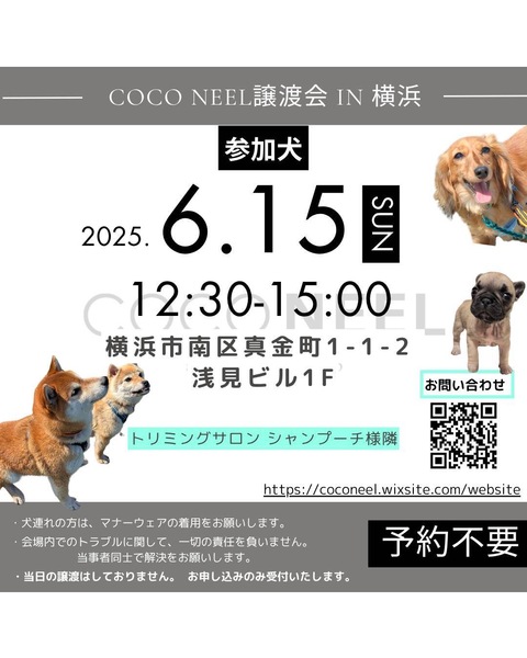 | イベント内容 | ・ ・ COCO NEEL 譲渡会 @横浜 2025.6.15(日)12:30〜 15:00 参加犬決定しました? ━━━━━━━━━━━━━━━ ?会場 横浜市南区真金町1-1-2 浅見ビル1F ?️の用意はありません? 近隣のコインパーキングのご利用をお願いいたします。 ????市営地下鉄ブルーライン阪東橋駅1A出口より徒歩10分 ━━━━━━━━━━━━━━━ 会場にてお見合いをご希望の方は、譲渡条件をよくご確認のうえ、里親希望エントリーフォームより事前エントリーお願いします。 詳細はHP、ブログからご確認ください。 ━━━━━━━━━━━━━━━ ?COCO NEELオリジナル チャリティーグッズを譲渡会特別価格にて販売します! ※売上は保護っ子達の医療費・活動費として大切にお預かりさせていただきます?♀️ ご協力お願いいたします。 ━━━━━━━━━━━━━━━ ⚠お願い⚠ ・ワンコ連れの方はマナーウェアの着用をお願いします。 ━━━━━━━━━━━━━━━ #お問い合わせはhpからお願いします #コメントDM対応しておりません ━━━━━━━━━━━━━━━ #coconeel #coconeel保護犬 #ココニール #ここにいる #保護犬 #里親募集 #里親募集中 #譲渡会 |