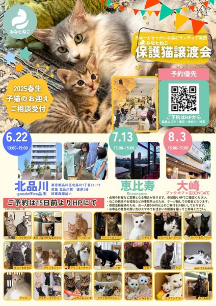 | イベント内容 | みなとねこが毎月定期開催している譲渡会です 2024年も譲渡会を通じて331匹もの猫を186家庭にご縁を繋ぐことができました 今回は北品川駅徒歩3分の会場での開催となります。 ご来場予約の上お越しいただきますとスムーズにご案内できます。 ご予約はみなとねこのHPよりお願いします https://www.minatoneco.com/event 会場や参加猫の詳細はこちら https://www.minatoneco.com/event/azabujuban ※参加猫たちの様子はみなとねこの各種SNSもご覧ください https://linktr.ee/minatoneco ーーー 会場は明るく開放的な雰囲気です Youtube「みなとねこ譲渡会に行ってみよう」 https://youtu.be/8Q4Gti1swQk 20ケージ 40匹ほどの参加となりますが、それ以外の預かり宅の猫もご紹介可能です 子猫は2匹ペアでの譲渡が原則です 初めての方こそ最初から2匹をお勧めしています また私たちボランティアは、ご縁のあった猫たちに終生里親様に愛されて幸せに安全に暮らして欲しいと願っています このため里親になっていただくにはいくつかの条件やお約束事があります。 ◆基本条件(猫それぞれ、保護主により異なります) ・ご家族全員が飼育に賛成であること ・ペット可物件での完全室内飼い、エアコンなどによる室温管理、医師の指示に従い定期的な受診やワクチン接種、 適切な時期(生後4ヶ月中)での避妊去勢、病気予防に配慮したフードの選択、終生飼養をお願いしております。 ・ケージのみの飼育、リビング以外の一室のみでの飼育は不可です。十分な運動のスペースと窓から景色が眺められのんびり日向ぼっこが可能な環境が望ましいと考えています。 ・誤食などの事故防止のため、お部屋の整理整頓や脱走防止にも万全の対策をお願いします。 ・換気が十分でない室内での喫煙をされる方はお断りしております。 ・日々のお世話だけでなく、スキンシップが可能な精神的・時間的・経済的な余裕がある方に限らせていただきます。猫が20年以上生きる中でなるべく変わらぬ環境で愛情を注いで頂けるよう、家族構成やお仕事、お住まいに変化のない方を優先させていただきます。 またお届けやフォローの都合上、募集エリアも東京、神奈川、埼玉に限らせていただいております。 ■里親申込書類一式はみなとねこHPよりダウンロードをお願いします https://www.minatoneco.com/foster-entry 会場では里親申込書を拝見して簡単なヒアリングを行います 会場にてご記入いただくことも可能ですが、面談希望の方が多いとお待ちいただくことになりますので、お手元で印刷していただきご記入の上ご来場いただくことをおすすめしております ※ご家族にアレルギーがある方、喫煙者がいる場合には是非事前にご相談ください ※猫と暮らしたことのない未就学児がいらっしゃる場合には事前にアレルギー検査などお勧めします 実際の参加予定猫 6/21(土)21:00までにみなとねこのHPやFacebookページでご紹介します https://m.facebook.com/minatoneco/ 直接ご応募の方は詳細をLINEなどでやりとりの上で預かり宅でのお見合いも行っております そうした中で譲渡会前に里親様が決定することもございますことご了承ください ※予約優先、30分入替制、混雑時は入場をお待ちいただくなどのご協力をお願いしております ※換気のためにドアをオープンしての開催のためにケージ越しでのご対面となりますことご理解ください ※譲渡会の開催や保護活動の継続のため、お一人様500円以上のご寄付をお願いしております |