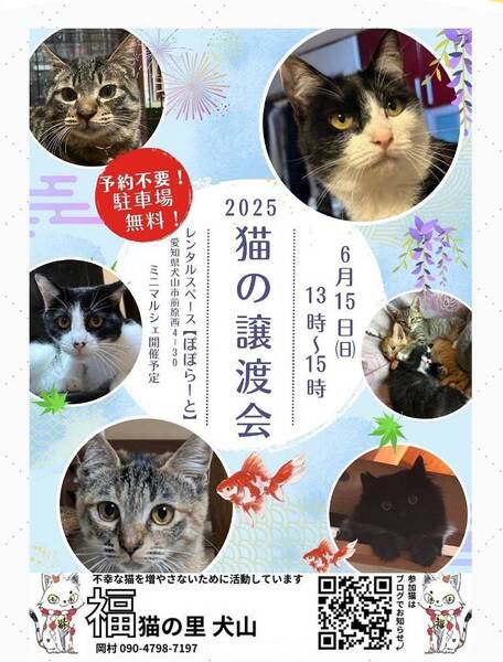 | イベント内容 | 【ココがポイント!】 ★ウイルスチェックなど健康診断済み! 【日時】 6月15日(日)13~15時 【場所】 レンタルスペースぽぽらーと (犬山市前原西4丁目30) 予約不要 広々駐車場あり 福猫の里 犬山「福猫の里便り」 https://hukunekonosato.hatenablog.com 【お約束】 当日、会場での猫の引き渡しはしておりません。 後日ご自宅までお届けします。 お試し飼育(トライアル)を1週間〜2週間程して頂き、双方が納得の上で正式譲渡となります。 譲渡の際は、医療費(ワクチン代等)、活動協力費の負担をお願いしております。 ・ペット可のお住まい ・完全室内飼育、終生飼育 ・適切な医療措置 ・不妊手術の実施と報告等、お約束があります。 《 譲渡に関するお願い 》 ◎猫の負担を考え、東海3県で車移動が1時間以内にお住まいの方。(遠方の方はお断りしています。)※通行料がかかりましたらご負担頂く場合もあります。 ◎高齢者のみ世帯への譲渡はお断りしています。託せる方がいれば、一緒に来場下さい。 ◎譲渡は、無償ではありません。猫によって費用が違いますので保護主にお尋ね下さい。 |