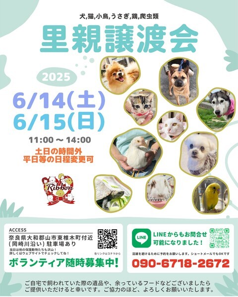 | イベント内容 | \譲渡会を開催します/ 子犬や子猫、小型犬から大型犬、かわいい猫ちゃんたちまで、たくさんの保護犬・保護猫が皆さんを待っています! 写真だけでは伝えきれない魅力が盛りだくさんなので、ぜひお気軽に足を運んでくださいね。 【里親募集中の犬猫情報はコチラ】 https://satoya-boshu.net/foster/?@button_name@=search&FosterParent_MemberID=85262 ●事前にお電話かショートメールでご予約をお願いします。 ・予約番号:090-6718-2672 ●ご希望の犬猫がいましたら、予約時に名前をお伝えください。 ●当日までに譲渡が決定した・体調がすぐれないなど、やむを得ない理由で急きょ不参加の場合があります。ご了承ください。 ●その場での引き渡しはしておりません。譲渡決定後、距離にかかわらずこちらからお届け致します。 みなさまのご来場をお待ちしております! ⚫︎りぼんは、奈良県で活動している動物保護団体です。 犬・猫・うさぎなどの小動物・インコやニワトリなどの鳥・両生類・爬虫類など動物種を問わず、お届け先も地域を問わず、動物たちと里親さまをつなぐ活動を行っています。 ◎ホームページ https://ribbon-foster.jimdofree.com/ ◎公式YouTube https://www.youtube.com/@ribbon-shelter https://www.instagram.com/ribbon_shelter/ https://www.instagram.com/ribbon_shelter1/ |