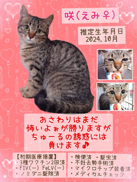 | イベント内容 | 【秘密結社ねこのひげ♡保護猫譲渡会】 6/15(日) 13:00~16:00 埼玉県鶴ヶ島市三ツ木新町1-1-13 カインズ鶴ヶ島店1F カルチャー教室 にて保護猫譲渡会を開催します♪ 初期医療を済ませた仔猫たちの お祭が始まっています☆ 脳内はまだまだ仔猫やでー! なオトナ猫も元気いっぱい参加します♪ ずっとのご家族さまと 愛し愛されな 両想いになれますように♡ 家族にするなら保護猫だべ♪♪ 新しい家族と笑顔で暮らしたい♪ という方は是非会いにいらしてください♡ ご不明な点がございましたら Instagram @nnnkanto DMにてお問い合わせ下さい☆ |