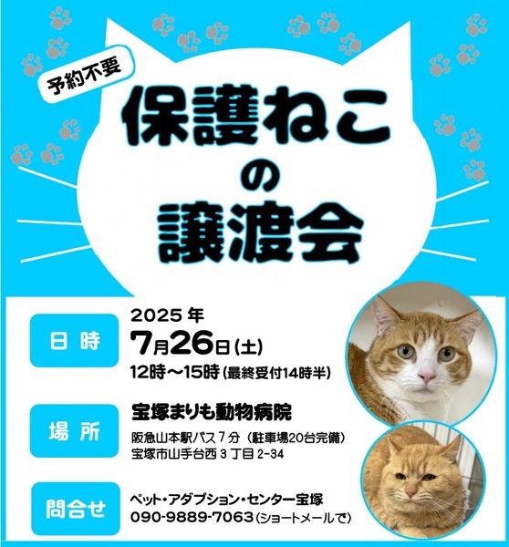 | イベント内容 | 保護ねこの譲渡会 in 宝塚 https://ameblo.jp/takarazuka-tnr/ 日時:2025年7月26日(土) 12時~15時 場所:宝塚まりも動物病院 阪急宝塚線『山本』駅よりバス7分 兵庫県宝塚市山手台西3丁目2-34 ※無料駐車場あります。 【予約不要】 直接会場へお越し下さい。 【ご注意事項】 必ずご一読下さい。 ※ 譲渡は先着順ではありません! すべての方の見学が終わってから猫達に いちばん合う里親様を決定させて頂きます。 ※当日、猫を連れて帰る事はできません。 里親様になって頂くことが決まりましたら、 後日ご自宅までお連れします。 ※里親のご希望をお断りする事も ありますのでご了承お願いいたします。 【主催】ペットアダプションセンター宝塚 【問合せ】 kaizaru7★yahoo.co.jp (★を@に変えて下さい) |