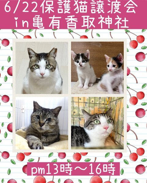| イベント内容 | 里親様との信頼関係を大切にして長年亀有にて譲渡会を開催しています⭐️お待ちしてます? (主に葛飾区足立区で活動しています!) |