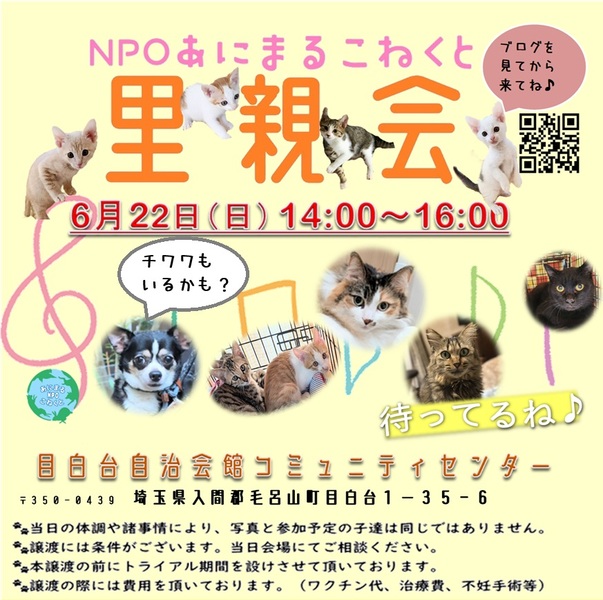 | イベント内容 | 今回は、チワワとヨーキーの参加もあります! 子猫は生後2カ月~半年以上経ってなかなか決まらない子まで、甘えん坊な成猫さんもいます! 詳細はブログをチェックをしてからお越しください♪ 日常ケアサービスやグッズ販売もあります♪ ※先着順ではなく里親会後に協議してより良い条件のご家族を選定させて頂いておりますので、お時間早い方が有利という事はありません^^ |