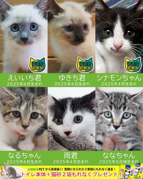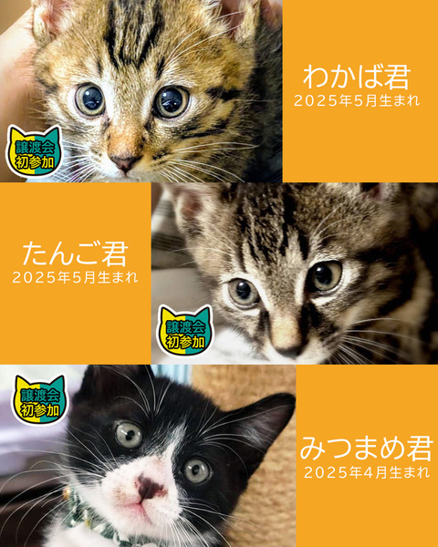 | イベント内容 | 子猫まつり第2弾の参加猫が決まりました! ラグドール系の子猫、シャム系の子猫、ニューフェース子猫など19匹が参加♪ ぜ~んぶ子猫!わちゃわちゃ子猫!賑やかですよ! http://miyoshineko.sblo.jp/article/191395009.html ■お休み猫 ラグドール系「おこめ♂」「おこわ♀」は便が緩くドクターストップではありませんが大事を取ってお休みとなりました。 次回7/6譲渡会に参加となります。 急なお知らせになりましたことをお詫び申し上げます。 他4匹のラグドール系は予定通り参加となります。 子猫まつり第2弾★みよし市 ■6月29日(日)10時~15時 ■みよし市カリヨンハウス(みよし市三好丘2-2-1) 【駐車場について】 子猫の譲渡会は大変混み合います。 会場は無料駐車場が48台分ございますが、他イベントがございますと満車の場合がございます。 しばらくお待ち頂くか、近隣の大型コイン駐車場のご利用、公共交通機関(三好ヶ丘駅から徒歩1分)でのご来場お願いします。 【ご来場前に】 ・混雑時は入場をお待ち頂く場合があります。 ・猫は先着や申入れの順番ではございません。 ・適正と条件を十分考慮させて頂き、15時に抽選を行いトライアル先を決めさせて頂きます。 ・当選されたご家庭のみに当日電話連絡を差し上げます。 ・体調不良等で不参加になる猫もございます。 【参加団体】 NPO法人三好ネコの会 https://www.instagram.com/miyoshineko あいち東郷ねこの会 https://www.instagram.com/togoneko ●子猫譲渡手数料 ワクチン1回接種/1匹20,000円・2匹38,000円 ワクチン2回接種/1匹30,000円・2匹58,000円 ※ラグドール系子猫の譲渡手数料は30,000円となります。 ※個人参加猫、他団体猫は上記手数料ではございません。 <もったいないを保護猫に> ご家庭で余っているフードを譲渡会場でお受け取りできます 買ったけど食べてくれない、飼い猫が亡くなって残ってしまったなど キャットフードドライブにご寄贈をお願いします。 |