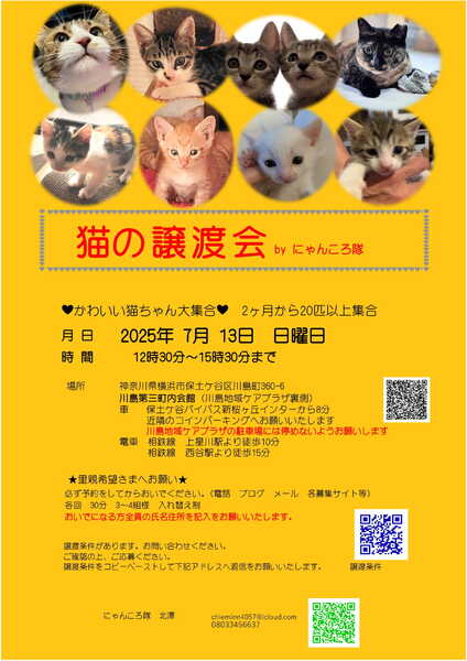 | イベント内容 | 猫ちゃんの譲渡会を開催いたします。 1.5ヶ月位からの猫さん20匹以上 大人猫さんも参加です。 月 日 2025年 7月13日 日曜日 時 間 12時30分~15時30分まで 場所 神奈川県横浜市保土ケ谷区川島町360-6 川島第三町内会館(川島地域ケアプラザ裏側) 車 保土ケ谷バイパス新桜ヶ丘インターから8分 近隣のコインパーキングにお願いいたします。 (手前にある川島地域ケアプラザの駐車場には停めないでください) 電車 相鉄線 上星川駅より徒歩10分 相鉄線 西谷駅より徒歩15分 ★里親希望さまへお願い★ 必ず予約をしてからおいでください。 各回 30分 3~4組様 おいでになる方全員の氏名住所を記入をお願いいたします。 譲渡条件があります。お問い合わせください。 ご確認の上、ご応募ください。 猫の譲渡について http://nyankorotai.blog.fc2.com/blog-category-5.html 上記の譲渡条件をコピーペーストして下記アドレスへ送ってください。 追ってご連絡いたします。 お電話にても受付いたします。 下記の譲渡条件を送ってくださっても大丈夫です。 ◆ご応募時に下記事項をお知らせください◆ 1.お名前、簡単な住所 2.先住動物の有無(ワクチン 不妊手術の有無等)と選んだ理由 3.家族構成(家族全員の年齢 関係 お仕事等) 4.住宅環境(一戸建て 分譲マンション 一戸建て賃貸 賃貸マンションペット可) 5.留守番の時間 6.下記の①~⑨までの同意 ◆応募者様へのお願い◆ ①一生涯、家族の一員としてくださる事(猫は20年生きます) ②完全室内飼いでお願いします。 (脱走防止対策をお願いします。ケージ 脱走防止扉 玄関窓等) ③不妊手術及び毎年のワクチン接種など健康管理 (不妊手術済のご連絡は必須) ④家族全員の同意があること ⑤ペット可住宅にお住まいであること。 (ペット不可にお住まいの方には譲渡できません) ⑥身分証明の提示及び誓約書を記入していただきます。 ⑦譲渡後の近況報告をしていただける方 ⑧譲渡費用等をご負担できる方 (初期医療行為は済ませてお届けします) ⑨ほとんどの猫さんがお外から保護した子です。 その辺の事をご理解していただける方 猫が小さい場合はお留守番の短い家を希望します。 ケージのご用意をお願いいたします。 申し訳ありませんが先住動物さんが4匹以上のご家庭はお断りさせていただいております。 無職 学生 未成年の方からの申込は受け付けておりません。 ご家族に未就学児のいるお家及び高齢者の方は要相談 2匹一緒を優先させていただきます。 双方の条件が合った場合は譲渡会又は保護先にお見合にきていだだき成立後に自宅室内へお届けいたします。 この時期なので近くに方を優先させていただく事もあります。 ご予約お待ちしております。 にゃんころ隊 http://nyankorotai.blog.fc2.com 担当 北澤(にゃんころ隊) chieminn4057@icloud.com |