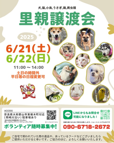 | イベント内容 | \譲渡会を開催します/ 子犬や子猫、小型犬から大型犬、かわいい猫ちゃんたちまで、たくさんの保護犬・保護猫が皆さんを待っています! 写真だけでは伝えきれない魅力が盛りだくさんなので、ぜひお気軽に足を運んでくださいね。 【里親募集中の犬猫情報はコチラ】 https://satoya-boshu.net/foster/?@button_name@=search&FosterParent_MemberID=85262 ●事前にお電話かショートメールでご予約をお願いします。 ・予約番号:090-6718-2672 ●ご希望の犬猫がいましたら、予約時に名前をお伝えください。 ●当日までに譲渡が決定した・体調がすぐれないなど、やむを得ない理由で急きょ不参加の場合があります。ご了承ください。 ●その場での引き渡しはしておりません。譲渡決定後、距離にかかわらずこちらからお届け致します。 みなさまのご来場をお待ちしております! ⚫︎りぼんは、奈良県で活動している動物保護団体です。 犬・猫・うさぎなどの小動物・インコやニワトリなどの鳥・両生類・爬虫類など動物種を問わず、お届け先も地域を問わず、動物たちと里親さまをつなぐ活動を行っています。 ◎ホームページ https://ribbon-foster.jimdofree.com/ ◎公式YouTube https://www.youtube.com/@ribbon-shelter https://www.instagram.com/ribbon_shelter/ https://www.instagram.com/ribbon_shelter1/ |