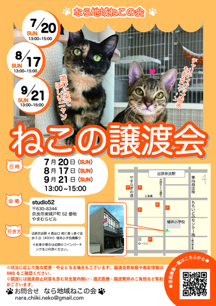 | イベント内容 | 毎月奈良市ならまちにて猫の譲渡会を行っております。 会場には会の保護猫ちゃんたちをはじめ、個人で活動されているボランティアさんが保護した猫や、一般の方に保護され里親さんを探している猫など、沢山の保護猫たちが里親さんとのご縁を待っています。 また、会場ではチャリティグッズ販売も行っております。 皆さまのお越しをお待ちしております。 ※譲渡会は予約なしでも入場できます。混み合う時間は入場制限にご協力をお願いいたします。 ※窓や出入口扉は常に解放しますので、猫が入っているケージを開けての触れ合いは不可とさせていただきます。 ※会場内では靴を脱いでいただくため、お手数ですが、スリッパや室内履きをご持参ください。 参加猫の詳細は下記SNSにて告知します。 【facebook】https://www.facebook.com/nara.chiiki.neko/ 【Instagram】https://www.instagram.com/nara.chiiki.neko/ ※急な変更がある可能性もございますので、最新の情報はSNSにてご確認お願いいたします。 |