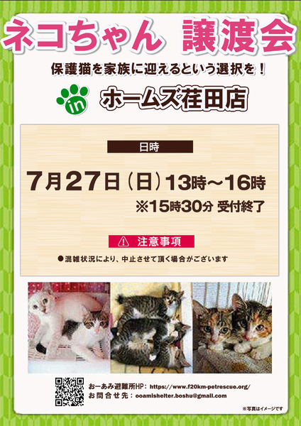 | イベント内容 | ☆★☆★☆★☆★☆★☆★☆★☆★☆★☆★☆★☆★☆ 7月27日(日)荏田にて譲渡会開催! ◎場所・・「ホームズ荏田店」 神奈川県横浜市青葉区荏田西1ー3ー14 田園都市線「江田」駅より徒歩約7分 246号線江田駅交差点そば ◎日程・・7月27日(日)(雨天決行) ◎時間・・13時から16時 【15時30分受付終了】 (会場に利用可能な無料駐車場がございます。そちらをご利用くださいませ。) *参加の際はアルコール消毒のご協力をお願いいたします。 *混雑状況により、中止させていただく場合がございます。 ※参加予定の犬猫は体調により参加できない場合があります。ご了承ください。 ☆★☆★☆★☆★☆★☆★☆★☆★☆★☆★☆★☆★☆ |