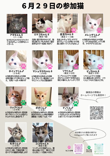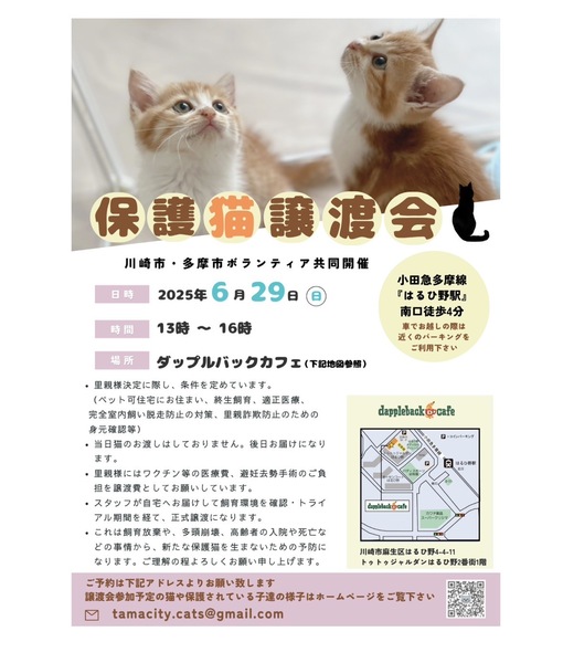 | イベント内容 | 【麻生区はるひ野】保護猫譲渡会 【日時】6月29日(日)13:00-16:00 【会場】ダップルバックカフェ カフェ隣のお部屋になります 【住所】神奈川県川崎市麻生区はるひ野4-4-11 トゥトゥジャルダンはるひ野二番街1F (小田急多摩線「はるひ野駅」南口から徒歩約2分 京王線「若葉台駅」から徒歩16分) 【ご予約お問い合わせ】tamacity.cats@gmail.com ※チラシに付いてるQRコードまたはこちらのリンクから猫たちの様子が見れます。 https://sites.google.com/view/cooneru/ ※完全予約制ではございませんが ご予約の方優先でご案内させていただきます。 予約の際はお時間指定していただけると助かります。 ※車でお越しの際は、近隣のコインパーキングをご利用下さい。 ※お店への直接のお問い合わせはお控え下さい。 見学希望の方や お迎えを検討中の方 物資の支援、ご寄付なども ぜひぜひお気軽にお越しください 素敵な出会い待ってます 【譲渡までの流れ】 ①譲渡会にて猫を決めたら預かりボランティアに話を聞く ②エントリーシートに記入 ③お届け(里親様宅へお伺いします) ④トライアル期間 ⑤誓約書を交わして本譲渡 【譲渡地域】 多摩市・府中市・日野市・八王子市・立川市・国立市・稲城市・相模原市・町田市・麻生区,他(片道1時間程度) 【譲渡条件】 ①ペット可住宅にお住まいで、同居の方全員の了解がある。 ②経済的・体力的・時間的に猫を養える見込みがある ③完全室内飼い ④終生飼育 ⑤子猫の場合は留守にする時間が短いご家庭 ※単身者・高齢者の方には後見人必須 |