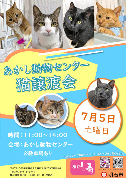 | イベント内容 | 以下はあかし動物センターHPからの転載です ↓ あかし動物センターに収容されている猫の譲渡会を行います。 費用:無料 ※譲渡対象となる猫についてはこちらをご覧ください。 https://www.city.akashi.lg.jp/kankyou/dobutsu/info/boshu.html ※猫に触れる場合は譲渡希望者登録が必要です。 ※明石市民以外も譲渡希望者登録できます。 ※譲渡希望者登録には審査があります。ご不安な方はあかし動物センターまで事前に電話でご相談ください。 078-918-5797 ※猫の譲渡は平常時も行っております |