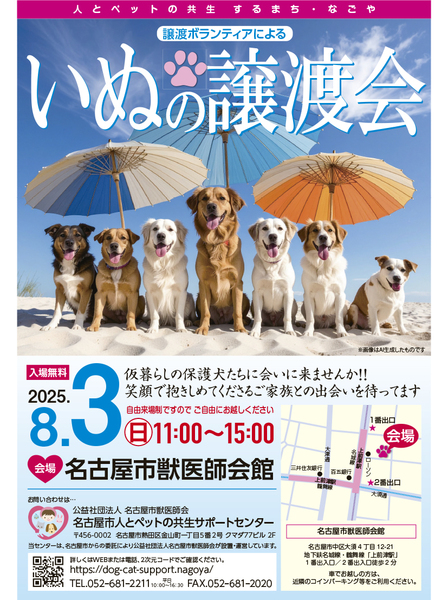 | イベント内容 | 名古屋市 人とペットの共生サポートセンター様の 譲渡ボランティアによる犬の譲渡会にファミーユも参加させていただきます! 場所: 名古屋市獣医師会館 時間: 11:00~15:00 譲渡会は入場無料、自由来場制です。 予約は不要です。お気軽にお越しください❣️ 詳しくはHPにてご確認ください↓ https://www.npo-famille.org/ |