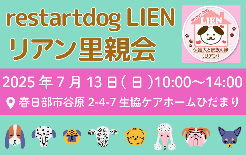 | イベント内容 | 保護犬の譲渡会です。 会場は屋内なので、涼しい環境でワンコ達と触れ合っていただけます。 参加は無料です。 お目当ての子が決まっておりましたら、リアンHPより予めご予約をいただけますとご案内がスムーズです。 「保護犬ってどんな子達なのかな」 「お迎え予定は決まってないけど話を聞いてみたい」 「とりあえず見てみたい!」 どんなきっかけでも構いません。 是非覗きにいらしてください。 ご来場をお待ちしています! |