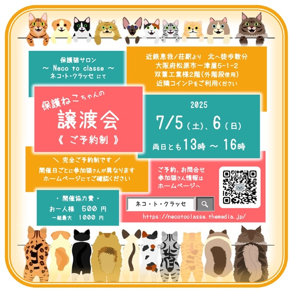 | イベント内容 | \\ 完全ご予約制 // 通常の譲渡会と異なり、完全ご予約制ですのでご注意くださいませ 。 ・ 下記ホームページよりご予約ください。 ・ ご予約受付は、当日10時までとさせていただきます。 ・ ご予約がない場合は開催中止となります。 https://necotoclasse.themedia.jp/ (Google等で「ネコトクラッセ」で検索できます) ※ 各猫さんの募集ページのタイトルに「◆7/5◆」または「◆7/6◆」と書かれた猫さんが参加します。 ※ 参加猫さんは一週間前頃から順次お知らせしていきます。 ※ 体調不良などで急遽不参加となる場合もございます。 ◇ 開催場所 ◇ 保護猫サロン ネコ・ト・クラッセ 大阪府松原市一津屋5-1-2 双葉工業株式会社様2階(外階段使用) 近鉄南大阪線恵我ノ荘駅から北へ徒歩約数分 (近隣コインパーキングをご利用ください) ◇ 当日のお願い事項 ◇ ・開催協力費としてお一人様 500円、1組最大 1000円 を頂戴しております。 ・猫さんの感染対策のため、入室時の手指消毒、靴下着用をお願いしております。 ・未成年、学生の方のみでのご来場はお断りしております。 ・先着順ではありません。また、当日連れて帰ることはできません。 ◇ 譲渡方法 ◇ ・後日ご自宅へのお届けとなります。その際、飼育環境、脱走防止策等の確認をさせて頂きます。 ・譲渡誓約書の取り交し、身分証明書のご提示(双方とも)をお願いしております。 ・トライアル期間(2週間程度)を経ての正式譲渡となります。 ◇ 譲渡条件 ◇ ・参加猫さんにはそれぞれ保護主様がおられ譲渡条件が異なりますが、下記は共通の条件となります。 (猫さんごとの詳細条件については、それぞれの募集ページをご確認ください) ・ペット飼育可住宅にお住まいの方。(犬や小動物のみの可の場合や頭数制限にご注意ください) ・ご家族全員の同意が得られている方。 ・仔猫さんの場合は、お留守番時間が短く(概ね3、4時間程度)少しの体調変化でもすぐに通院できる方。 ・トライアル期間中は頻繁に、譲渡後も折を見て状況報告をして下さる方。 ・完全室内飼い、ケージのご用意、脱走防止対策に最善を尽くして下さる方。 (ご想像以上に脱走したまま帰って来られなくなる猫さんが沢山います。玄関を開けた際の足下のすり抜けが非常に多いため、市販の柵やDIYで玄関ドアまで来られない対策をお願いしております。) |