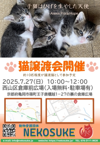 | イベント内容 | 西山霊園の近くの倉庫広場で譲渡会を開催いたします。 5月に当会が発足し、初の譲渡会開催となります。 至らないところもあるかと思いますが、改善していきますので、どうぞよろしくお願い致します。 夏の真っ盛りなので、午前の開催となります。 お申し込みは不要です。 お気軽にお越しください。 かわいい猫さんがたくさん集まります。 ぜひ、運命の出会いを見つけてくださいね! ※譲渡会の日がご都合が悪い場合は、個別のお見合いも可能です。 |