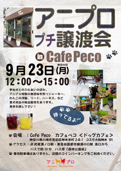 | イベント内容 | 9月23日(月)秋分の日 12:00~15:00 参加犬とのふれあい のほか, アニプロ特製の無添加手作りジャーキー、わんこの洋服、リード、ハーネスなど、愛犬用品の物品販売もあり。 是非お越し下さい! 会場:CafePeco カフェペコ <ドッグカフェ> 神奈川県川崎市宮前区神木本町2-8-1 コスモ大和神木101 アクセス:JR武蔵溝ノ口・東急田園都市線溝の口駅 南口から バスで約10分 バス停「森林公園前」 ※専用駐車場はありません。 近隣のコインパーキングをご利用下さい。 |