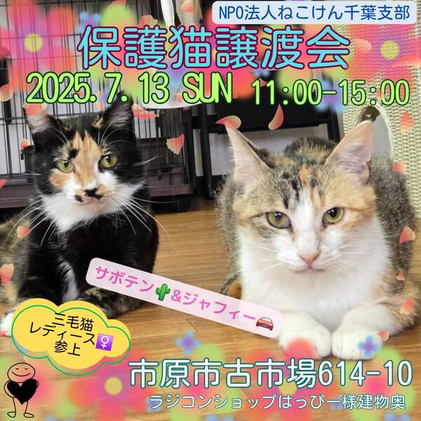 | イベント内容 | 今年生まれの子猫からシニア猫まで、沢山の保護猫達が譲渡会に参加します♪ ブログにて、譲渡会に参加する猫さん達を紹介しております。 ねこけん千葉支部ブログ→ https://ameblo.jp/nekoken-chiba/ また、譲渡会会場では、千葉県内にお住いの預かりボランティアさん及びお世話ボランティアさんを募集しています。 ご希望の方は、大変お手数をおかけしますが、譲渡会までお越しください。 ※ご都合がつかない場合は、お問い合わせ先までご相談ください。 [日時] 7月13日(日)11:00~15:00 [会場] 千葉県市原市古市場614-10 ※屋内での開催となり雨天決行です。 ※抱っこもOK! ※猫ちゃんの負担も考え、ご来場は時間内にお願い致します。 ※特にご予約などは必要ございませんのでご家族皆様でぜひお越し下さい。 ※駐車場あり。 [交通] 交通機関を利用してお越しの方 JR内房線 浜野駅より徒歩13分 浜野駅は、東京駅から京葉線→内房線でおよそ50分の距離!! お車でお越しの方 京葉道路蘇我インターより車で10分 ※駐車場はラジコンショップハッピー様裏手にございます駐車場をご利用ください [譲渡ご希望の方へのお願い] 誠に恐れ入りますが下記に当てはまります方への譲渡は不可となりますので予めご了承下さい。 ①学生さん、未成年の方、安定収入のない方 ②ペットを飼う事を許されていない住宅にお住まいの方 ③身体的、精神的疾病で治療中の方 ※60歳以上の方は別途条件がございますのでご相談下さい。 [譲渡の流れ] お申込み→審査→後日お届け→トライアル→正式譲渡 ※当日のお連れ帰りは出来ませんので予めご了承ください。 ※仮譲渡時にご希望の猫ちゃんにかかった医療費(ウイルス検査・ワクチン・駆虫・不妊去勢手術等)をご負担願います。 しかし、正式譲渡に至らなかった場合は医療費を全額返済致します。 [主催] 動物愛護団体 NPO法人ねこけん 千葉支部 [ブログ] https://ameblo.jp/nekoken-chiba/ [参加動物] 成猫・子猫 [お問い合わせ] ご不明な点、ご質問等ございましたら下記までお問い合わせください。 chiba.info@nekoken.jp |