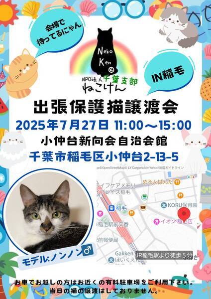 | イベント内容 | 7月も出張譲渡会を開催します♪ 今年生まれの子猫からシニア猫まで、沢山の保護猫達が譲渡会に参加します。 ブログにて、譲渡会に参加する猫さん達を紹介しております。 ねこけん千葉支部ブログ→ https://ameblo.jp/nekoken-chiba/ また、譲渡会会場では、千葉県内にお住いの預かりボランティアさん及びお世話ボランティアさんを募集しています。 ご希望の方は、大変お手数をおかけしますが、譲渡会までお越しください。 ※ご都合がつかない場合は、お問い合わせ先までご相談ください。 [日時] 7月27日(日)11:00~15:00 [会場] 千葉県千葉市稲毛区小仲台2-13-5 小仲台新向会自治会館 (イオン稲毛店様 立体駐車場入り口から徒歩1分) ※屋内での開催となり雨天決行です。 ※抱っこもOK! ※猫ちゃんの負担も考え、ご来場は時間内にお願い致します。 ※特にご予約などは必要ございませんのでご家族皆様でぜひお越し下さい。 [交通] 交通機関を利用してお越しの方 JR稲毛駅 東口より徒歩5分 お車でお越しの方はお近くの有料駐車場をご利用ください。 [譲渡ご希望の方へのお願い] 誠に恐れ入りますが下記に当てはまります方への譲渡は不可となりますので予めご了承下さい。 ①学生さん、未成年の方、安定収入のない方 ②ペットを飼う事を許されていない住宅にお住まいの方 ③身体的、精神的疾病で治療中の方 ※60歳以上の方は別途条件がございますのでご相談下さい。 [譲渡の流れ] お申込み→審査→後日お届け→トライアル→正式譲渡 ※当日のお連れ帰りは出来ませんので予めご了承ください。 ※仮譲渡時にご希望の猫ちゃんにかかった医療費(ウイルス検査・ワクチン・駆虫・不妊去勢手術等)をご負担願います。 しかし、正式譲渡に至らなかった場合は医療費を全額返済致します。 [主催] 動物愛護団体 NPO法人ねこけん 千葉支部 [ブログ] https://ameblo.jp/nekoken-chiba/ [参加動物] 成猫・子猫 [お問い合わせ] ご不明な点、ご質問等ございましたら下記までお問い合わせください。 chiba.info@nekoken.jp |