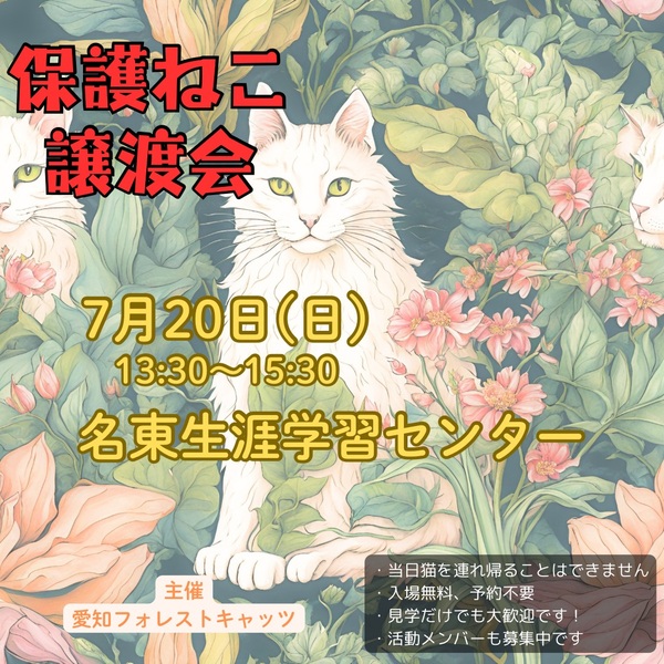 | イベント内容 | 日時 7月20日(日) 13時30分〜15時30分 場所 名東生涯学習センター 主催 愛知フォレストキャッツ 地域猫活動やTNR活動の過程などで 保護した猫たち 今年生まれの子猫が参加予定です! 子猫もいれば、大人猫もいます 見学、相談だけでも大丈夫! 予約不要、参加費無料なのでお気軽に 猫に関する活動を何かしたい、という方も歓迎です 遊びに来る感覚で、お越しくださいませ ☆猫に関して☆ 各団体の保護主さんごとに決めているお約束事があります ・当日は猫を連れ帰ることはできません ・猫を迎えるにあたり、飼育環境などについて お話しをさせていただきトライアル(お試し飼育) から始めさせていただきます ・2週間前後のトライアル期間を経て、問題ない ようであれば、譲渡契約書を結び正式譲渡と なります ・所定の譲渡費用をいただきます |