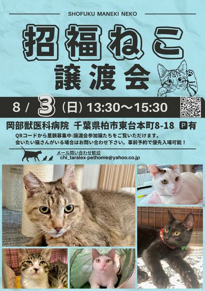 | イベント内容 | 招福ねこ譲渡会:個人ボラが集い月一開催! 8/3(日) 13:30〜15:30(最終入場15:15) 場所:岡部獣医科病院 P有 千葉県柏市東台本町8-18 駐車スペースが満車の場合近隣コインパーキングのご利用をお願いします。 ※注意事項 動物病院待合室での小規模の譲渡会のため一度に入場いただける人数に限りがございます。また、事前予約無しでの来場の場合 お待たせしてしまう可能性がございます。大変申し訳ありませんが、屋外でお待ちいただく際は熱中症対策をお願いいたします。 ・予約無し来場可能ですが、事前予約問い合わせをオススメします!下記リンク内、メール問い合わせ欄からお願いします。 https://lit.link/c8bf52d5-3ef4-4ea4-856a-92b8bd4cd24f ご来場お待ちしております! 【ボランティア募集】 譲渡会参加ボランティア、保護猫の幸せためにご自身ができる事からお手伝い・応援してくださるボランティアさん大募集です! |