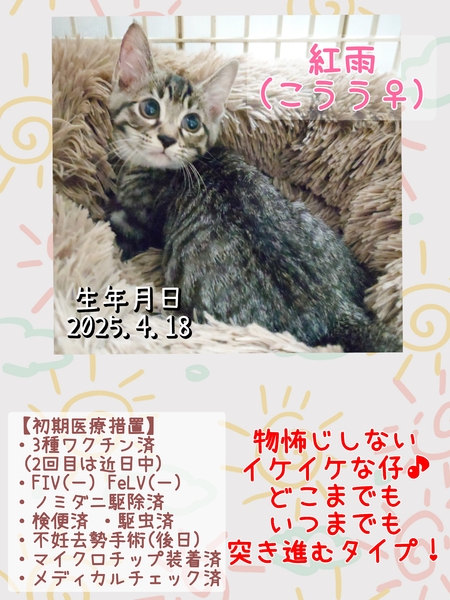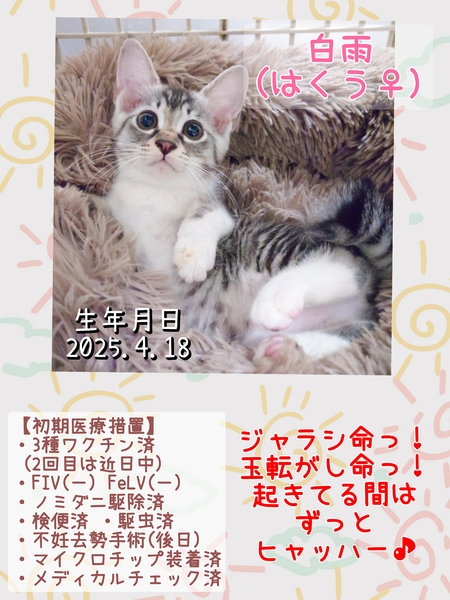 | イベント内容 | 【秘密結社ねこのひげ☆保護猫譲渡会】 7/6(日) 16:30~19:30 ※ナイターです♪ 譲渡会のハシゴも可能な時間♪ 川越市高階公民館 講座室2号 (〒350-1142 埼玉県川越市藤間27-1) ⊰᯽⊱┈──╌❊╌──┈⊰᯽⊱ 初期医療を済ませ 巣立ちの準備が整った 春生まれの仔猫たちや 元仔猫のモフモフオトナっ仔たちが ワラワラと参加します♪ 赤い糸をゆっくーーりと 手繰り寄せているいつメンたちも♪ 一同笑顔いっぱいで譲渡会に挑みます♪ 未来のずっとのご家族さまと 愛し愛されな両想いになれますように♡ 是非会いにいらしてくださーい♪ ヾ(*´∀`)ノ もちろん見学だけでもWelcomeです♪ ご不明な点がございましたら Instagram➡@nnnkanto DMにてお問い合わせください☆ |