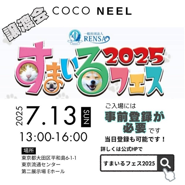 | イベント内容 | ・ ・ すまいるフェス2025 in 平和島 参加犬決定しました! すまいるフェス2024 in平和島の譲渡会に参加させていただきます 【日時】2025年7月13日(日) 13:00~16:00 【場所】〒143-0006 東京都大田区平和島6-1-1東京流通センター 第二展示場 Eホール 【主催】一般社団法人RENSA すまいるフェス実行委員会 【特別協賛】ロイヤルカナンジャポン合同会社 【入場】無料 ※事前登録が必要 ※当日登録も可能 ⚠譲渡会場エリアは犬猫の同伴出来ません。 詳細は【すまいるフェス2025 in 平和島】HPをご確認お願いします。 https://smile-fes.jp/?utm_source=instagram&utm_medium=social&utm_campaign=2025&fbclid=PAQ0xDSwLOB01leHRuA2FlbQIxMQABp0XWhSKPPB2y9KsCah3V3hvU9noAjlag5xTiCpbQ0q-e5NJxIa1eLfprRYjE_aem_gW6wH2_A8M8nBmIHjstL2g @smilefes2025 ━━━━━━━━━━━━━━━ 会場にてお見合いをご希望の方は、譲渡条件をよくご確認のうえ、里親希望エントリーフォームより事前エントリーお願いします。 詳細はHP、ブログからご確認ください。 ━━━━━━━━━━━━━━━ ?COCO NEELオリジナル チャリティーグッズを譲渡会特別価格にて販売します! ※売上は保護っ子達の医療費・活動費として大切にお預かりさせていただきます?♀️ ━━━━━━━━━━━━━━━ #coconeel #ココニール #ここにいる #譲渡会 #保護犬 |