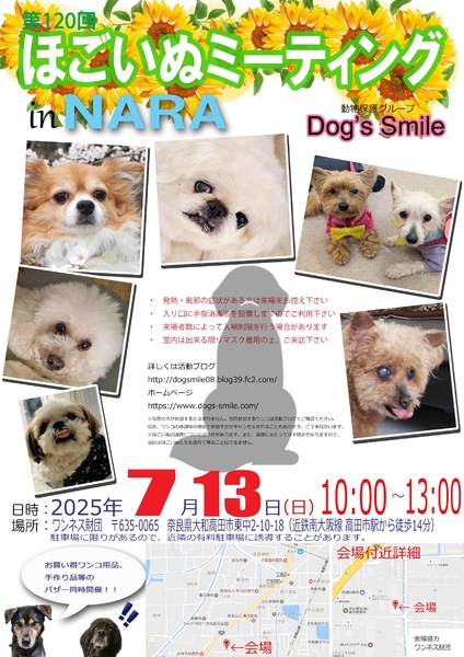 | イベント内容 | 7月13日(日曜日)10時~13時、奈良県大和高田市のワンネス財団エモーショナルリテラシーセンターをお借りして「第120回ほごいぬミーティングat奈良大和高田」を開催します。 保護犬を家族に迎えようと考えている方、保護犬に会ってみたい方、保護犬について知りたい方、ぜひご来場ください。 相性を見るためなど先住わんこさん、卒業わんこさんのご参加ももちろんOKです。 当日は、Dog's smileグッズやワンコ用品の販売、Dog's smileを応援してくださる方々が手作りされた手作り雑貨などの販売も行います。どれもお買い得です。 また、売り上げは、私たちの活動資金になります。ぜひご協力をお願いします。 来場者のみなさまには、感染症の予防に御協力をお願いします。 ・発熱・風邪の症状のある方の入場は御遠慮願います。 ・入場時は、手指消毒への御協力をお願いします。 ・来場者の状況により、入場制限を行う場合があります。 なお、来場予定のワンコについては、活動ブログでご確認ください。 日時 令和7年7月13日(日)午前10時~午後1時 場所 ワンネス財団エモーショナルリテラシーセンター 奈良県大和高田市東中2-10-18 (近鉄南大阪駅高田市駅から南に徒歩14分) 協力 ワンネス財団、株式会社松田電気工業 |