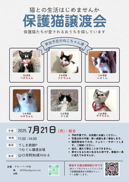 | イベント内容 | 予約不要・参加料無料、お気軽にお越しください。 ミルクから育てた子猫はじめ元野良猫、人馴れした成猫まで参加します。 猫飼い始めての方もフォローいたします。猫との生活初めてみませんか。 みんな人馴れしたかわいい子です。 インスタで参加の子を紹介しています。随時更新中です。 ぜひご覧ください。 https://www.instagram.com/kurobanokai/ 譲渡会でお待ちしています。 |