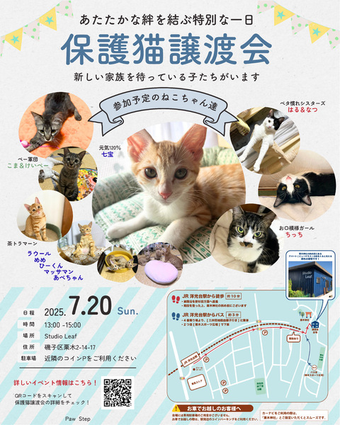 | イベント内容 | 総勢14匹の猫たちの譲渡会です。 下は2ヶ月から上は1歳弱の子まで 個性豊かな子達が参加します! ぜひ、みんなに会いに来てください☺️ |