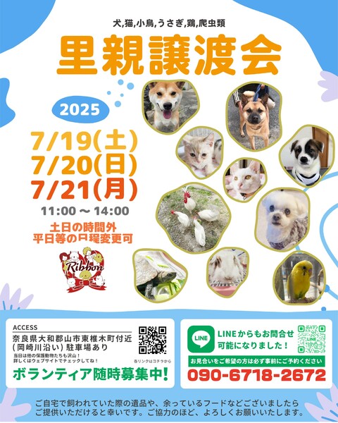 | イベント内容 | \3連休は!りぼん譲渡会へ/ 子犬や子猫、小型犬から大型犬、かわいい猫ちゃんたちまで、たくさんの保護犬・保護猫が皆さんを待っています! 写真だけでは伝えきれない魅力が盛りだくさんなので、ぜひお気軽に足を運んでくださいね。 【里親募集中の犬猫情報はコチラ】 https://satoya-boshu.net/foster/?@button_name@=search&FosterParent_MemberID=85262 ●事前にお電話かショートメールでご予約をお願いします。 ・予約番号:090-6718-2672 ●ご希望の犬猫がいましたら、予約時に名前をお伝えください。 ●当日までに譲渡が決定した・体調がすぐれないなど、やむを得ない理由で急きょ不参加の場合があります。ご了承ください。 ●その場での引き渡しはしておりません。譲渡決定後、距離にかかわらずこちらからお届け致します。 みなさまのご来場をお待ちしております! ⚫︎りぼんは、奈良県で活動している動物保護団体です。 犬・猫・うさぎなどの小動物・インコやニワトリなどの鳥・両生類・爬虫類など動物種を問わず、お届け先も地域を問わず、動物たちと里親さまをつなぐ活動を行っています。 ◎ホームページ https://ribbon-foster.jimdofree.com/ ◎公式YouTube https://www.youtube.com/@ribbon-shelter https://www.instagram.com/ribbon_shelter1/ |