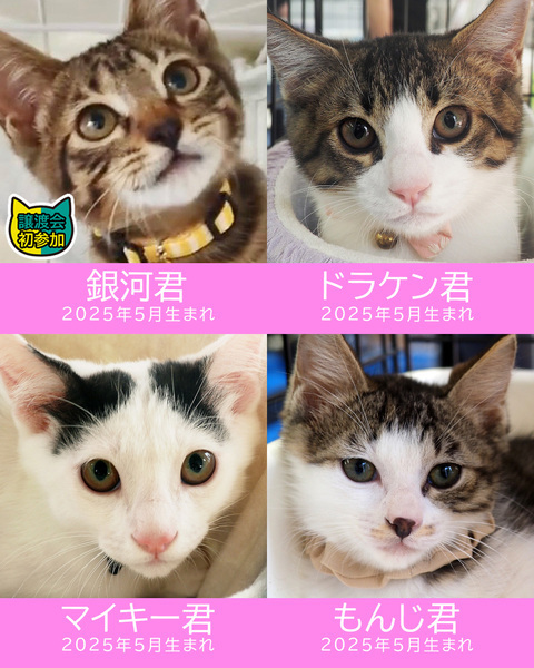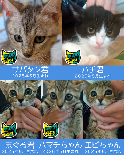 | イベント内容 | 子猫まつりが終わったら子猫まつり(=^・・^=) 子猫中心に27匹参加予定!!まだまだ子猫がたくさんいます。 健診結果待ちの子猫が複数いますのであと数匹増えるかも!? エアコンで涼しい屋内会場で好きなだけ抱っこしてください。 【子猫まつり第6弾】子猫中猫27匹★みよし市 ■8月3日(日)10時~15時 ■みよし市カリヨンハウス(みよし市三好丘2-2-1) 参加猫 http://miyoshineko.sblo.jp/article/191434959.html <<駐車場について>> 子猫の譲渡会は大変混み合います。 会場は無料駐車場が48台分ございますが、他イベントがございますと満車の場合がございます。 しばらくお待ち頂くか、近隣の大型コイン駐車場のご利用、公共交通機関(三好ヶ丘駅から徒歩1分)でのご来場お願いします。 <<参加団体>> NPO法人三好ネコの会 https://www.instagram.com/miyoshineko あいち東郷ねこの会 https://www.instagram.com/togoneko 猫暖心 https://www.instagram.com/nekodangonet <<ご来場前に>> ・子猫の譲渡会は大変混み合います。混雑時は入場をお待ち頂く場合があります。 ・猫は先着や申入れの順番ではございません。 ・適正と条件を十分考慮させて頂き、トライアル先は抽選で決まります。 ・当選されたご家庭のみに当日電話連絡を差し上げます。 ・体調不良等で不参加になる猫もございます。 ●子猫譲渡手数料 ワクチン1回接種/1匹20,000円・2匹38,000円 ワクチン2回接種/1匹30,000円・2匹58,000円 ●成猫/オス30,000円・メス35,000円 ※成猫は不妊去勢済、ワクチン済です。 ※個人参加猫、他団体猫は上記手数料ではございません。 【もったいないを保護猫に】 ご家庭で余っているフードを譲渡会場でお受け取りできます 買ったけど食べてくれない、飼い猫が亡くなって残ってしまったなど キャットフードドライブにご寄贈をお願いします。 |