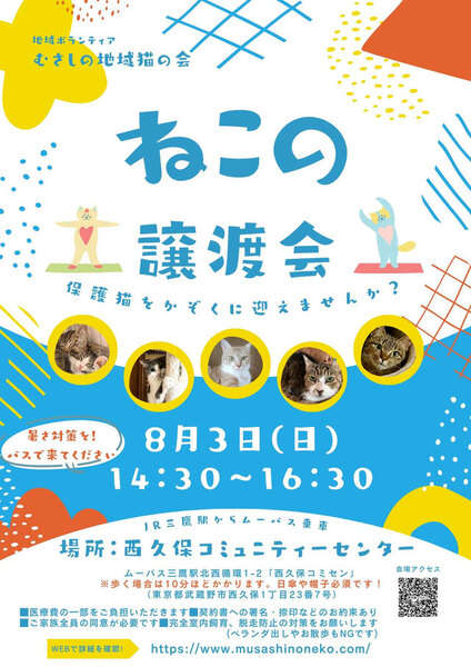 | イベント内容 | 8月3日(日) 14:30~16:30(時間がいつもと異なりますのでご注意ください) 場所:西久保コミュニティーセンター 東京都武蔵野市西久保1丁目23番7号 <交通> ①ムーバス ムーバス三鷹駅北西循環1-2「西久保コミセン」 ②徒歩 JR三鷹駅北口徒歩10分 ご予約などはいりませんので、当日時間内にお越しください。 当日、抱っこなどはできません。また、当日連れて帰ることはできません。 詳しくはホームページ里親さんになるまでの手順をご覧ください。 ~里親さまへのお願い~ ・完全室内飼育をお願いします ・脱走防止策の徹底をお願いします ・綺麗で片付いたお部屋と、日向ぼっこできる場所をご用意ください ・なにがあっても最後のときまで一緒に居てあげてください 猫も人間と同じように歳を取ります。 終生責任をもって愛情を注いでくださる方のお申し込みを希望しています。 よろしくお願いいたします。 https://www.musashinoneko.com/zyoutokai/ |