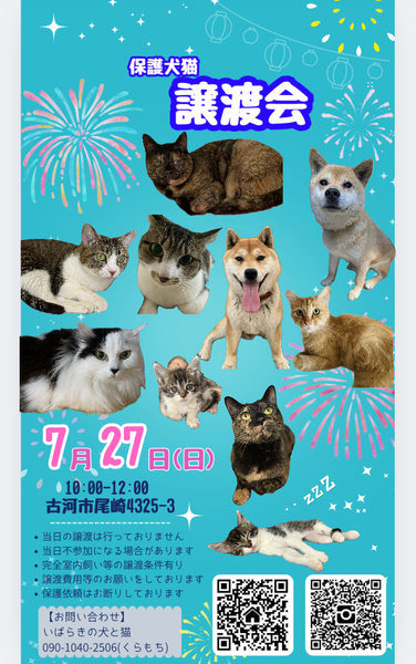 | イベント内容 | 保護犬猫を家族に迎えてみませんか? ずっとのおうちを待っています.* 迎えたい方も会ってみたい方もどなたでも大歓迎です♪ 保護っ子 元気いっぱいお待ちしております!! 予約不要/雨天決行/駐車スペース有 (開催場所が分かりにくいので下記の連絡先までご連絡頂ければご案内致します) ※譲渡条件などありますので当会の里親募集ページやHPをご確認ください※ 【不要になったフード(未開封).タオル.ペットシートなどありましたら、ご寄付いただけると助かります】 ⚫︎お問合せ⚫︎ 電話▷090-1040-2506 (クラモチ) LINE ID▷ 717217 (モトハシ) |