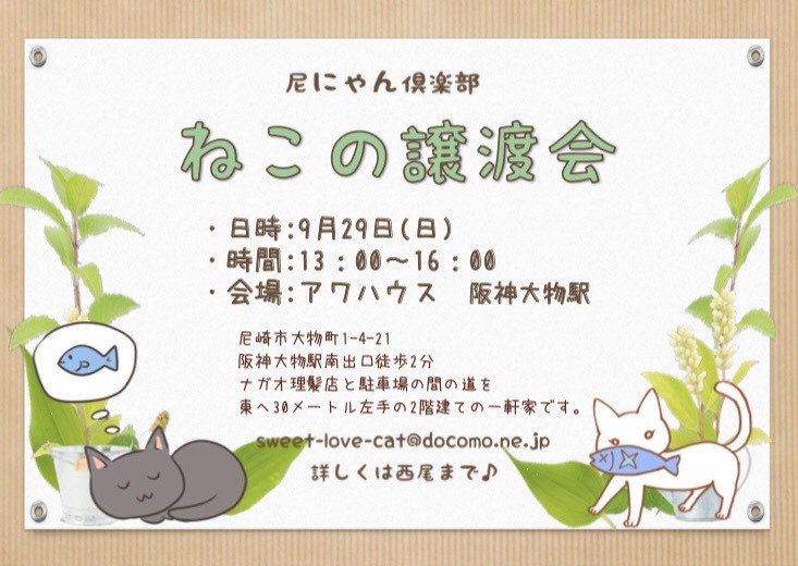 | イベント内容 | 阪神沿線の個人で活動している仲間が集まって 「ねこの譲渡会」を開催いたします。 ★猫は欲しいけど審査が厳しくて ★触らせて欲しいんだけどなぁ ★高齢者はダメかしら? 色々不安のある方 是非いらしてください。保護主の方の考えは色々です。 お話を聞いてOKと言ってくださる保護主の方もいるかもしれません。 とりあえず保護猫カフェに遊びに来る感じで見に来てみませんか? 一生の家族になるのですから実際に見て触れて 保護主の方とたくさん話してから 家族となる猫ちゃんを見つけてくれたら嬉しいです。 ▲注意事項▲ ・当日、保護猫は連れて帰れません。 ・車の方は近くのコインパーキングにお願いします。 |