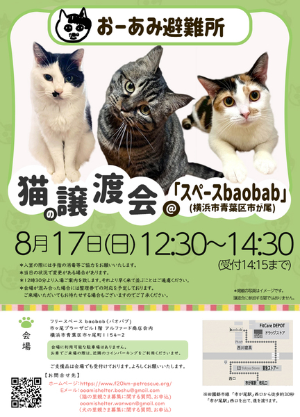 | イベント内容 | ☆★☆★☆★☆★☆★☆★☆★☆★☆★☆★☆★☆★☆ ~8月17日(日)市ヶ尾にて譲渡会開催!~ ◎場所・・「スペースbaobab」 神奈川県横浜市青葉区市ヶ尾町1154-2 市ヶ尾プラーザビル1階アルファード商店会内 田園都市線「市が尾」駅西口より徒歩約30秒 ◎日程・・8月17日(日)(雨天決行) ◎時間・・ 12:30~14:30 (会場に利用可能な駐車場はございません。近隣のコインパーキングをご利用ください。) *参加の際は、アルコール消毒のご協力をお願いいたします。 *混雑状況により、入場制限をさせていただく場合がございます。 ※参加予定の犬猫は体調により参加できない場合があります。ご了承ください。 ☆★☆★☆★☆★☆★☆★☆★☆★☆★☆★☆★☆★☆ |
