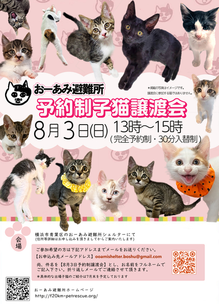 | イベント内容 | ☆★☆★☆★☆★☆★☆★☆★☆★☆★☆★☆★☆★☆ ~8月3日(日)おーあみ避難所シェルターにて完全予約制譲渡会開催!~ ◎場所・・「おーあみ避難所シェルター」 神奈川県横浜市青葉区 (住所等詳細はお申し込みを頂きましてからご案内いたします) ◎日程・・8月3日(日)(雨天決行) ◎時間・・ 13:00~15:00 (30分入替制) ご参加希望の方は下記アドレスまでメールをお送りください。 【お申し込み先メールアドレス】 ooamishelter.boshu@gmail.com 尚、件名を【8月3日予約制譲渡会】とし お名前をフルネームでご記入下さい。 折り返しメールでご連絡させて頂きます。 沢山のご参加をお待ちしています。 ※具体的な出場子猫のご紹介は7月末を予定しております。 ☆★☆★☆★☆★☆★☆★☆★☆★☆★☆★☆★☆★☆ |