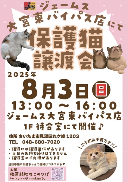 | イベント内容 | 8/3(日)13:00~16:00は♪ ジェームス大宮東バイパス店 〒337-0001 埼玉県さいたま市見沼区丸ヶ崎1203 にて♪ 秘密結社ねこのひげ 保護猫譲渡会を開催します☆ カー用品を見に来たらば… 保護猫譲渡会をやっててビックリ! (⊙⊙)ファッ!? 車のメンテナンスに来たらば… 保護猫がいぱーーい♪で (*´Д`*)ハァハァ♡ 新しい家族を探しに来たらば… 出逢っちゃった♡ (o・ω[+]ロックオン!! などなど♪ お迎え目的の方はもちろんのこと そうでない方も!! 是非お気軽にお立ち寄りくださいませ☆ (ΦωΦ)ココロヨリオマチシテマース♡ ご不明な点がございましたら インスタグラム @nnnkanto 秘密結社ねこのひげ の DMまでお問い合わせ下さい☆ |