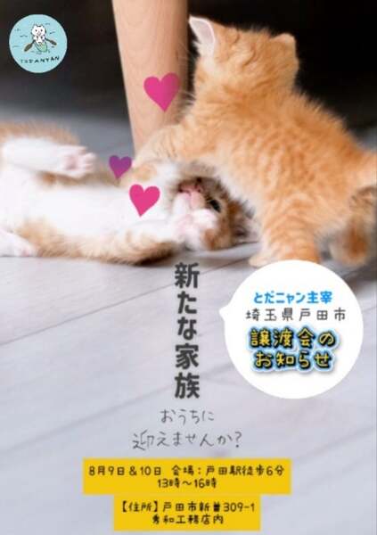 | イベント内容 | 子猫のみの譲渡会を開催致します。 日程 8月9日(土) 13:00~16:00まで 8月10日(日) 13:00~16:00まで 場所 秀和工務店 JR埼京線 戸田駅 東口 徒歩4分 住所 〒335-0021 埼玉県戸田市新曽309−1 ヤオコーから徒歩90秒のところにあります。 室内開催のため雨天でも開催します。 可愛い子猫が6頭並びます。 子猫の様子はブログをご覧になって下さい。 アメブロ https://ameblo.jp/sakutotaro203/ インスタ @toda_nyan 当会の譲渡会は予約制ではありません。 どうぞお気軽にお越し下さいませ。 注意:子猫の場合トライアルはありません。良くお考えの上、お申込み下さいませ。 いつもながらのお願いですみません。 募金箱を設置します。 募金のご協力をお願い致します。 フード、トイレ砂のご支援を お願い致します。 銘柄なんでもOK。 開封済みOK。 但し賞味期限以内のものでお願い致します。 頂いたフードは餌やりさんにもお裾分けしています。 どうぞよろしくお願いいたします。 主催 とだニャン 協力 秀和工務店 |