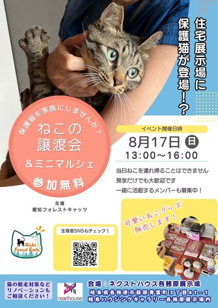 | イベント内容 | 日時 8月17日(日) 13:00〜16:00 場所 岐阜県各務原市蘇原青雲町3-41-1 ネクストハウス各務原展示場 岐阜ハウジングギャラリー各務原 内 スーパーマーケットバローの目の前です 主催 愛知フォレストキャッツ 地域猫活動やTNR活動の過程などで 保護した猫たち たくさんの猫たちが参加します 見学、相談だけでも大丈夫! 予約不要、参加費無料なのでお気軽に 猫に関する活動を何かしたい、という方も歓迎です 買うだけで保護猫支援になる、チャリティーねこマルシェも同時開催です。 素敵なオリジナル猫グッズを手に入れるチャンス!? 遊びに来る感覚で、お越しくださいませ |