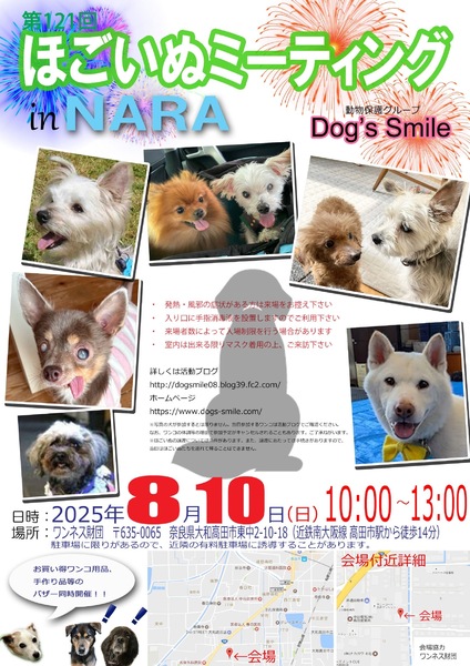 | イベント内容 | 8月10日(日曜日)10時~13時、奈良県大和高田市のワンネス財団エモーショナルリテラシーセンターをお借りして「第121回ほごいぬミーティングat奈良大和高田」を開催します。 保護犬を家族に迎えようと考えている方、保護犬に会ってみたい方、保護犬について知りたい方、ぜひご来場ください。 相性を見るためなど先住わんこさん、卒業わんこさんのご参加ももちろんOKです。 当日は、Dog's smileグッズやワンコ用品の販売、Dog's smileを応援してくださる方々が手作りされた手作り雑貨などの販売も行います。どれもお買い得です。 また、売り上げは、私たちの活動資金になります。ぜひご協力をお願いします。 来場者のみなさまには、感染症の予防に御協力をお願いします。 ・発熱・風邪の症状のある方の入場は御遠慮願います。 ・入場時は、手指消毒への御協力をお願いします。 ・来場者の状況により、入場制限を行う場合があります。 なお、来場予定のワンコについては、活動ブログでご確認ください。 日時 令和7年8月10日(日)午前10時~午後1時 場所 ワンネス財団エモーショナルリテラシーセンター 奈良県大和高田市東中2-10-18 (近鉄南大阪駅高田市駅から南に徒歩14分) 協力 ワンネス財団、株式会社松田電気工業 |