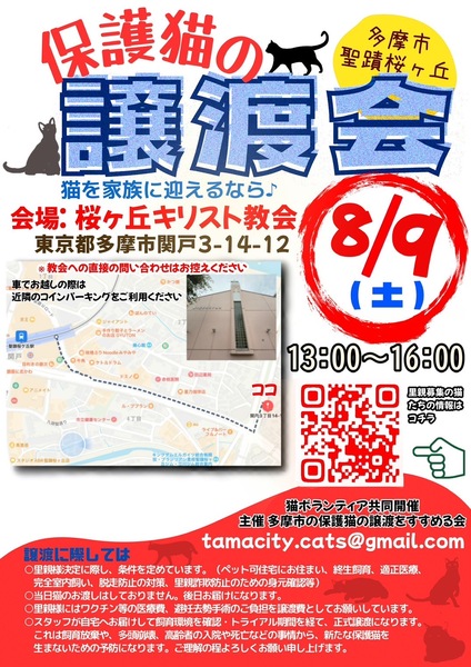 | イベント内容 | 【多摩市聖蹟桜ヶ丘】保護猫譲渡会 多摩市を中心に猫ボランティア協働で保護猫の譲渡会を開催しています。 事情があって保護された猫さんたちが参加予定です。 チラシに付いてるQRコードまたは こちらのリンクから 猫たちの様子が見れます。 https://sites.google.com/view/cooneru/ 完全予約制ではありませんが、予約された方から優先的にご案内致します。 参加お申込み・お問合せは コチラ tamacity.cats@gmail.com 【日時】8月9日(土) 13:00〜16:00 【場所】桜ヶ丘キリスト教会 多摩市関戸3-14-12 (聖蹟桜ヶ丘駅徒歩8分) ※車でお越しの際は近隣のコインパーキングをご利用下さい。 【譲渡までの流れ】 ①譲渡会にて猫を決めたら預かりボランティアに話を聞く ②エントリーシートに記入 ③お届け(里親様宅へお伺いします) ④トライアル期間 ⑤誓約書を交わして本譲渡 【譲渡地域】 多摩市・府中市・日野市・八王子市・立川市・国立市・稲城市・相模原市・町田市・麻生区、他 【譲渡条件】 ①ペット可住宅にお住まいで、同居の方全員の了解がある。 ②経済的・体力的・時間的に猫を養える見込みがある ③完全室内飼い ④終生飼育 ⑤子猫の場合は留守にする時間が短いご家庭 ※単身者・高齢者の方には後見人必須 |
