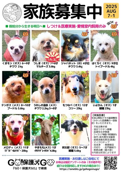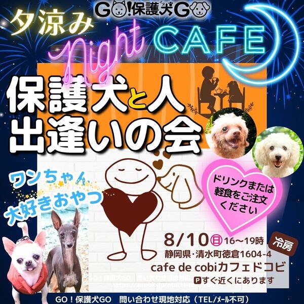| イベント内容 | 保護団体からも拒絶されたら生きる資格ないですか? 予約不要。社会性しつけ済。快食快便(笑)で元気な子が大集合します。紹介・リピート譲渡多数の実績。 愛と根気で、譲渡してから里親さんが苦労する『しつけ』を代わりにやっておきました! だから『保護犬だから飼いやすい』んです。うちの保護犬日本一!命をかけて通院・しつけ・心のリハビリをしています。 百聞は一見にしかず。アットホームで素敵なカフェで運命の子に出逢いませんか? **保健所や殺処分場、劣悪なブリーダー出身、誰も保護に手をあげなかった犬たちです。 とき:8月10日(日)16~19時 場所:カフェドコビ(〒411-0917 静岡県駿東郡清水町徳倉1604-4) お車:Ⓟ徒歩すぐ・現地にてご案内 できれば:入場は無料ですがドリンクや軽食のご注文大歓迎です しつけ途中の、飼い主を探すための犬たちです。無償のふれあい動物園ではありません。お子さんに犬を触らせたい方、愛犬と遊ばせたい方はご遠慮願います。 ゆるぎない覚悟で犬との幸せをつかみたい方ぜひお越しください。 私GO!保護犬GOの目の下のクマは毎晩のしつけの証です。大目に見てくださいませ。 日頃の活動はブログにて GO!保護犬GO https://ameblo.jp/gohogoinugo/ インスタグラム @gohogoinugo |