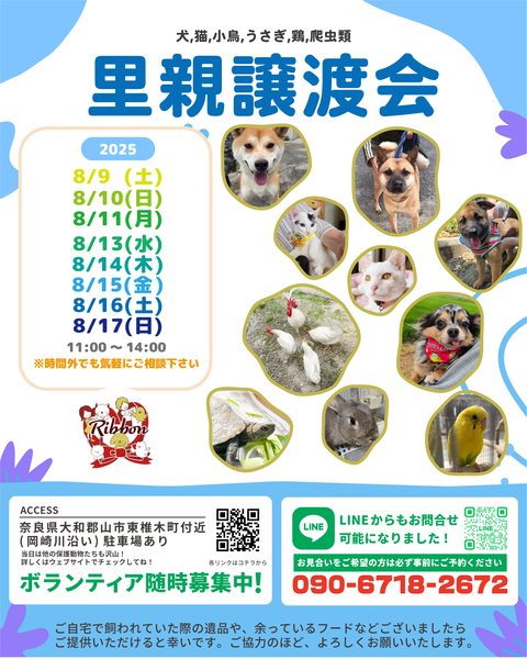 | イベント内容 | \8月9〜17日に譲渡会を開催します/ ※12日を除きます。ご注意ください。 子犬や子猫、小型犬から大型犬、かわいい猫ちゃんたちまで、たくさんの保護犬・保護猫が皆さんを待っています! 写真だけでは伝えきれない魅力が盛りだくさんなので、ぜひお気軽に足を運んでくださいね。 【里親募集中の犬猫情報はコチラ】 https://satoya-boshu.net/foster/?@button_name@=search&FosterParent_MemberID=85262 ●事前にお電話かショートメールでご予約をお願いします。 ・予約番号:090-6718-2672 ●ご希望の犬猫がいましたら、予約時に名前をお伝えください。 ●当日までに譲渡が決定した・体調がすぐれないなど、やむを得ない理由で急きょ不参加の場合があります。ご了承ください。 ●その場での引き渡しはしておりません。譲渡決定後、距離にかかわらずこちらからお届け致します。 みなさまのご来場をお待ちしております! ⚫︎りぼんは、奈良県で活動している動物保護団体です。 犬・猫・うさぎなどの小動物・インコやニワトリなどの鳥・両生類・爬虫類など動物種を問わず、お届け先も地域を問わず、動物たちと里親さまをつなぐ活動を行っています。 ◎ホームページ https://ribbon-foster.jimdofree.com/ ◎公式YouTube https://www.youtube.com/@ribbon-shelter https://www.instagram.com/ribbon_shelter1/ |