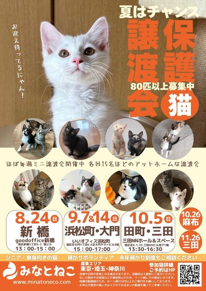 | イベント内容 | みなとねこが毎月定期開催している譲渡会です 今回は新橋駅から徒歩2分の港区で一番古い、昭和7年に誕生した堀ビル、登録有形文化財が2020年にgoodoffice新橋としてリノベーションされたそのラウンジで開催いたします。 ご来場予約の上お越しいただきますとスムーズにご案内できます。 ご予約はみなとねこのHPよりお願いします https://www.minatoneco.com/event 会場や参加猫の詳細はこちら https://www.minatoneco.com/shinbashi ※参加猫たちの様子はみなとねこの各種SNSもご覧ください https://linktr.ee/minatoneco ーー Youtube「みなとねこ譲渡会に行ってみよう」 https://youtu.be/8Q4Gti1swQk 20ケージ 40匹ほどの参加となりますが、それ以外の預かり宅の猫もご紹介可能です 子猫は2匹ペアでの譲渡が原則です 初めての方こそ最初から2匹をお勧めしています また私たちボランティアは、ご縁のあった猫たちに終生里親様に愛されて幸せに安全に暮らして欲しいと願っています このため里親になっていただくにはいくつかの条件やお約束事があります。 ◆基本条件 (猫それぞれ、保護主により異なります) ・ ご家族全員が飼育に賛成であること ・ペット可物件での完全室内飼い、エアコンなどによる室温管理、医師の指示に従い定期的な受診やワクチン接種、 適切な時期(生後4ヶ月中)での避妊去勢、病気予防に配慮したフードの選択、終生飼養をお願いしております。 ・ケージのみの飼育、リビング以外の一室のみでの飼育は不可です。十分な運動のスペースと窓から景色が眺められのんびり日向ぼっこが可能な環境が望ましいと考えています。 ・誤食などの事故防止のため、お部屋の整理整頓や脱走防止にも万全の対策をお願いします。 ・換気が十分でない室内での喫煙をされる方はお断りしております。 ・日々のお世話だけでなく、スキンシップが可能な精神的・時間的・経済的な余裕がある方に限らせていただきます。猫が20年以上生きる中でなるべく変わらぬ環境で愛情を注いで頂けるよう、家族構成やお仕事、お住まいに変化のない方を優先させていただきます。 またお届けやフォローの都合上、募集エリアも東京、神奈川、埼玉に限らせていただいております。 ■里親申込書類一式はみなとねこHPよりダウンロードをお願いします https://www.minatoneco.com/foster-entry 会場では里親申込書を拝見して簡単なヒアリングを行います 会場にてご記入いただくことも可能ですが、希望の方が多いとお待ちいただくことになりますので、お手元で印刷していただきご記入の上ご来場いただくことをおすすめしております ※ご家族にアレルギーがある方、喫煙者がいる場合には是非事前にご相談ください ※猫と暮らしたことのない未就学児がいらっしゃる場合には事前にアレルギー検査などお勧めします 実際の参加予定猫 譲渡会前日の21:00までにみなとねこのHPやFacebookページでご紹介します https://m.facebook.com/minatoneco/ 直接ご応募の方は詳細をLINEなどでやりとりの上で預かり宅でのお見合いも行っております。 そうした中で譲渡会前に里親様が決定することもございますことご了承ください ※予約優先、30分入替制、混雑時は入場をお待ちいただくなどのご協力をお願いしております ※換気のためにドアをオープンしての開催のためにケージ越しでのご対面となりますことご理解ください ※譲渡会の開催や保護活動の継続のため、お一人様500円以上のご寄付をお願いしております |