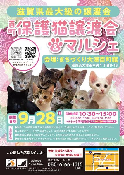 | イベント内容 | 滋賀県最大級の保護猫譲渡会。 毎回40頭以上の猫さんが参加します。 初めての方でも安心して譲渡の安心サポートの譲渡会です。 予約不要、入場無料。 参加猫さんのご紹介は https://ameblo.jp/hyakucyojyoutokai または、Instagram @hyakucyoujyotokai をご覧下さい。 ※後援 滋賀県・大津市・大津市社会福祉協議会 |