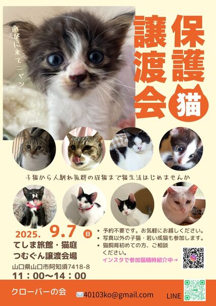 | イベント内容 | 現在授乳中の子猫も体調観察しながら参加予定です。 生後2ヶ月未満の子は予約という形で、譲渡は生後2ヶ月過ぎてからになります。 参加予定の子の日常はインスタで紹介しています。 https://www.instagram.com/kurobanokai/ 譲渡会では見られないいつもの姿を是非ご覧ください。 猫飼育初めてで不安で踏み出せない方、サポート、フォロー致しますのでご相談ください。 お気に入りの子はふれあいできる譲渡会です。是非ご来場ください。 猫を保護されて里親探しをされている方、譲渡会に参加させたい猫がおられる方、インスタDMからご相談ください。 #保護猫 #譲渡会 #つむぐん譲渡会 #クローバーの会 #里親募集 #子猫 |
