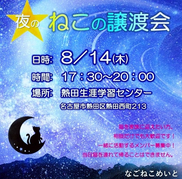 | イベント内容 | 夏休み夜の譲渡会 18:30〜20:00 可愛い保護猫ちゃん達が大集合! 生まれて間もなく人の手で育てられた子猫から、しっとり落ち着いた成猫まで、甘えん坊が皆さまのご来場をお待ちしています♪ 予約不用、入場料無料 譲渡会が初めての方もお気軽にお越しください。 気さくなスタッフがご案内させて頂きます |