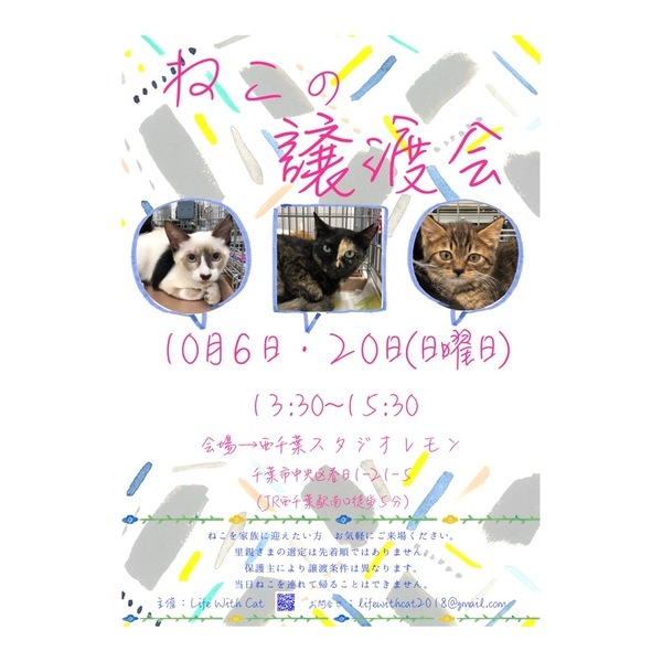 | イベント内容 | 個人ボラさんが愛情をかけて保護している大きな猫ちゃんや小さな猫ちゃんたちが ずっとのお家を求めて集まります。 ねこを家族に迎えたいとお考えの方 どうぞお気軽にご来場ください! *里親さまの選定は先着順ではありません。 *保護主により譲渡条件は異なります。 *当日ねこちゃんを連れて帰ることは出来ません。 後日 保護主が里親様宅へお届けいたします。 *里親様に医療費のご負担をお願いしております。 第22回 Life With Cat『ねこの譲渡会』 10月20日(日曜日) 13:30~15:30 <会場> レンタルスタジオレモン 260-0033 千葉市中央区春日1丁目21-5 (JR西千葉駅/京成西登戸駅より徒歩4分) *駐車場のご用意はございません。 スタジオより徒歩1分圏内にコインパーキングが多数ありますので そちらをご利用ください。 ブログ→https://ameblo.jp/lifewithcat2018/ Facebook→https://www.facebook.com/lifewithcat2018/ メールでのお問い合わせ→lifewithcat2018@gmail.com |