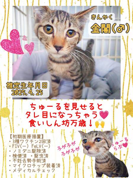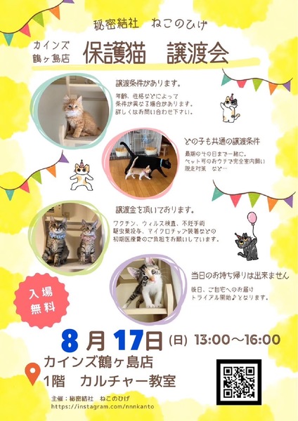 | イベント内容 | 【秘密結社ねこのひげ♡保護猫譲渡会】 8/17(日) 13:00~16:00 埼玉県鶴ヶ島市三ツ木新町1-1-13 カインズ鶴ヶ島店1F カルチャー教室 にて保護猫譲渡会を開催します♪ 初期医療を済ませた仔猫たちの大祭! が始まっています☆ 脳内はまだまだ仔猫やでー! なオトナ猫も元気いっぱい参加します♪ ずっとのご家族さまと 愛し愛されな 両想いになれますように♡ 家族にするなら保護猫だべ♪♪ 新しい家族と笑顔で暮らしたい♪ という方は是非会いにいらしてください♡ ご不明な点がございましたら Instagram @nnnkanto DMにてお問い合わせ下さい☆ |